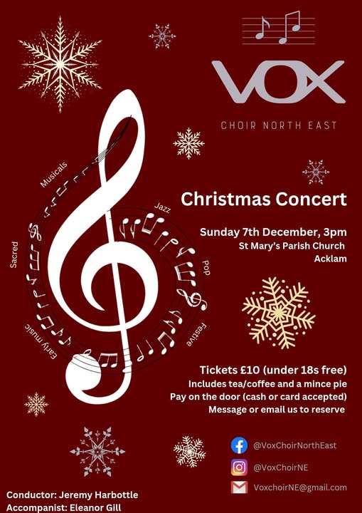 On Sunday 7th December at 3.00pm, there will once again be a Christmas Concert in church given by Vox Choir North East.